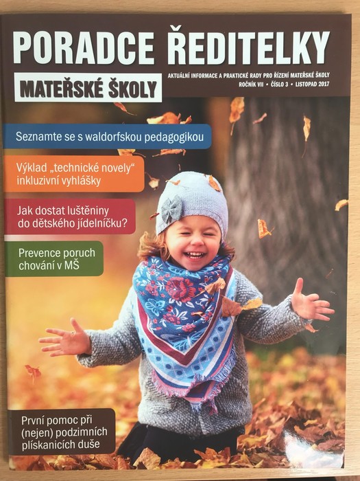 Listopad 2017. Časopis Poradce ředitelky mateřské školy přináší aktuální informace z oblasti předškolního vzdělávání a řízení MŠ. Jedná se o první časopis tohoto druhu na trhu, přináší přehled o všech novinkách a povinnostech vyplývajících z platné legislativy.